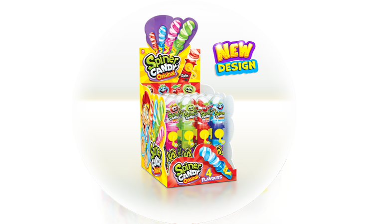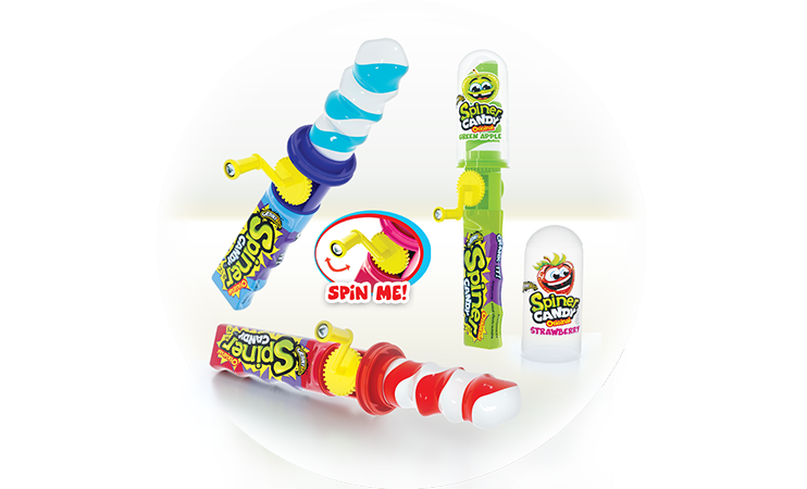 “Spinning” lollipop that is put in motion with crank handle. Turn the crank and lollipop rotate itself.